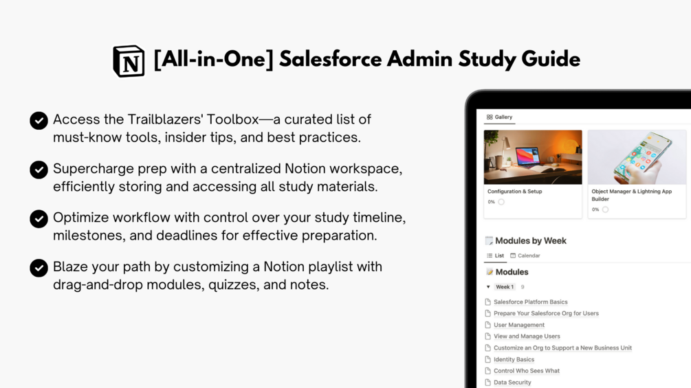 Our Notion Salesforce Admin Study Guide Template is more than just a study aid; it's your pathway to expertise. Whether you're advancing your career or seeking to master Salesforce Admin concepts, our template is your key to success.